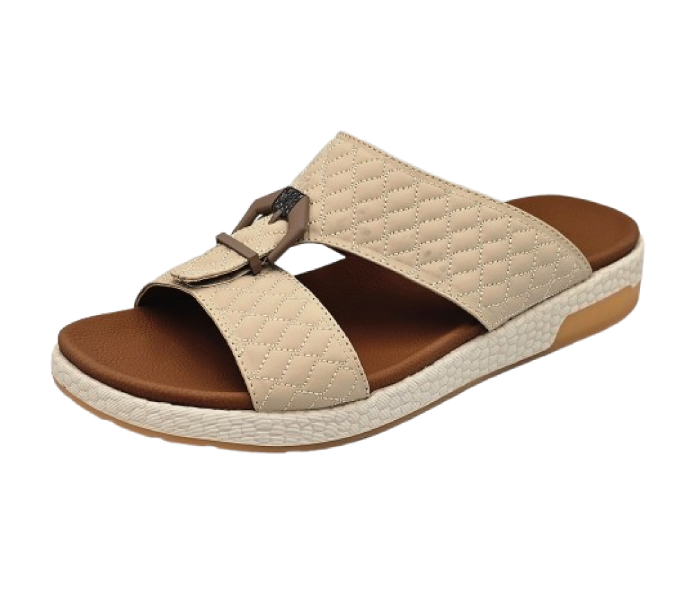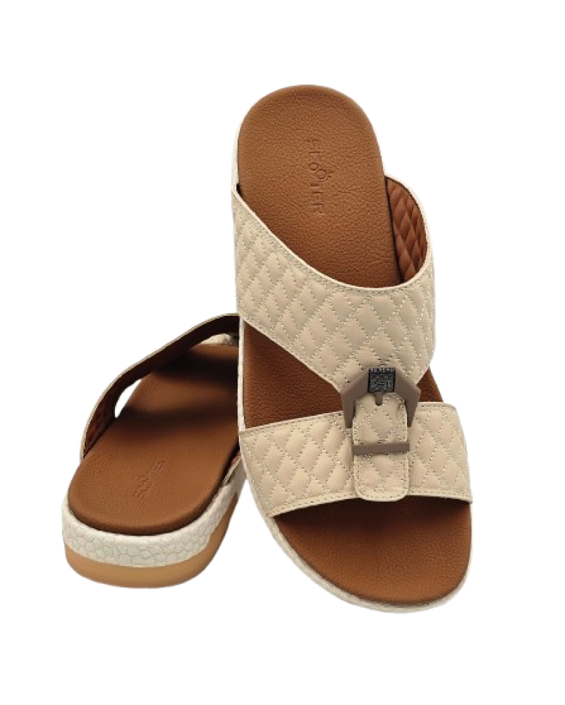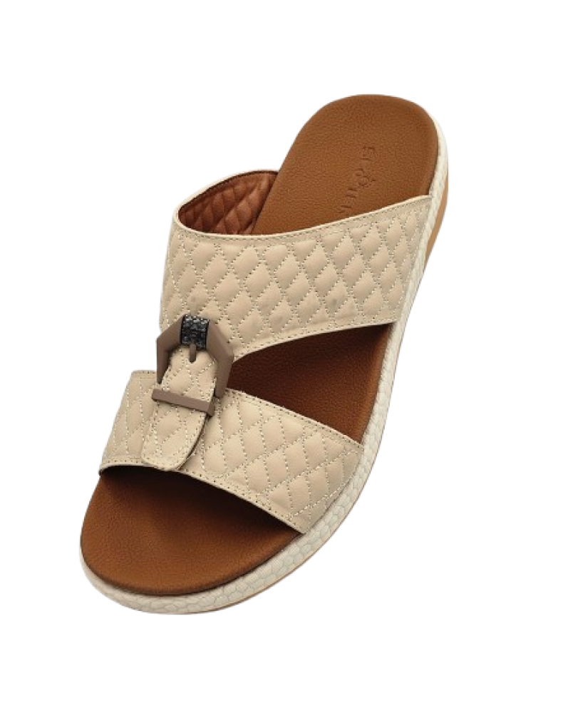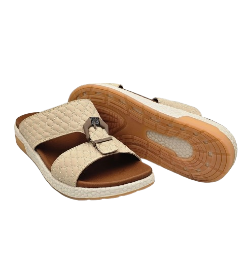 نعال خليجي فاخر بيج مصنوع من جلد طبيعي عالي الجودة، يتميز بتصميم أنيق ومريح يناسب مختلف المناسبات. يعتمد على تقنية أرضية المناطق الخمس الألمانية التي توفر دعماً مريحاً وثباتاً أثناء المشي.