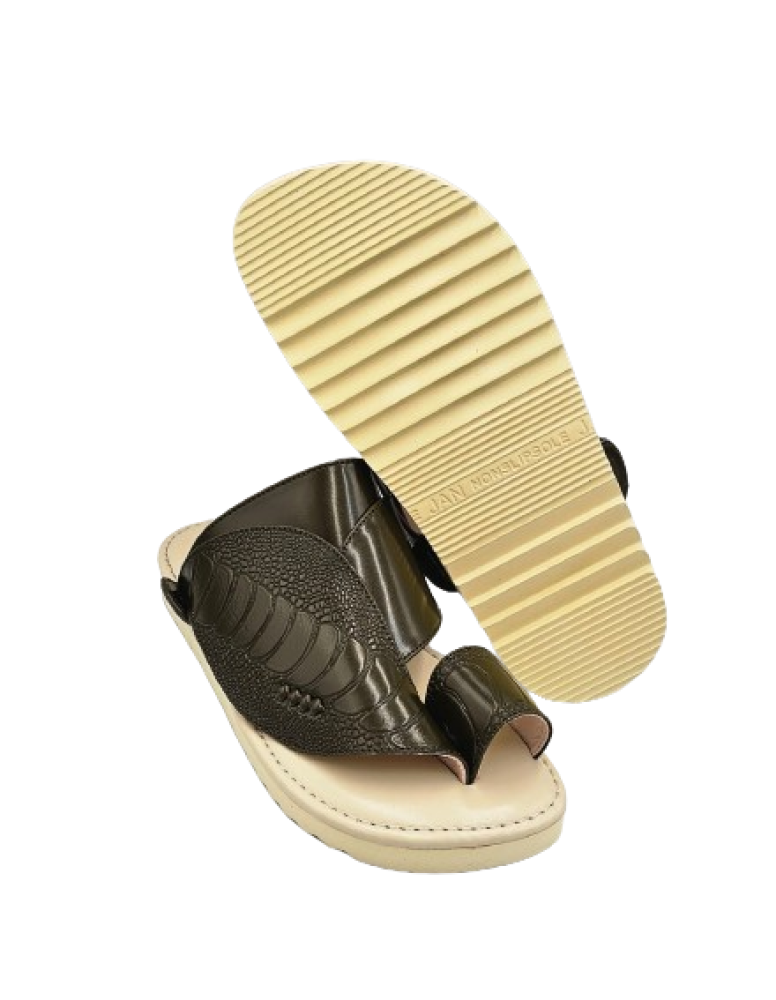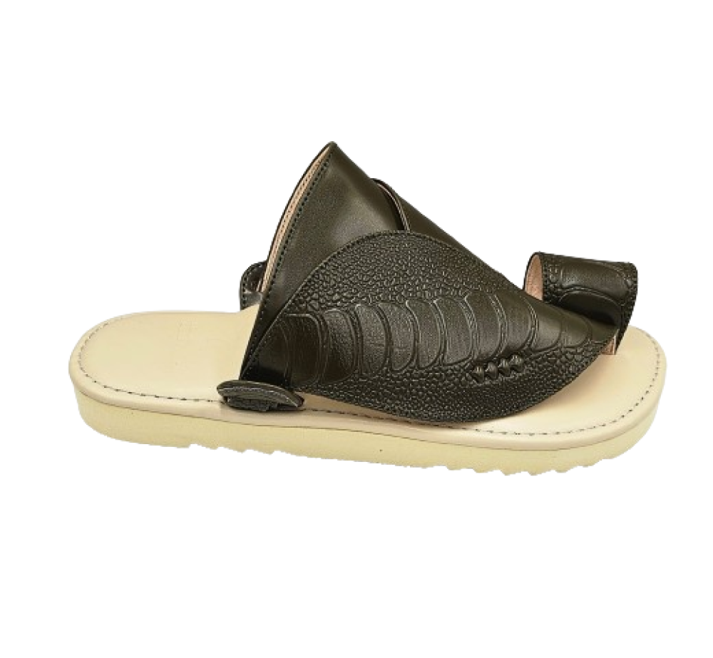 مواصفات حذاء رجالي شرقي سادة طبعة ساق النعام لون زيتي :
