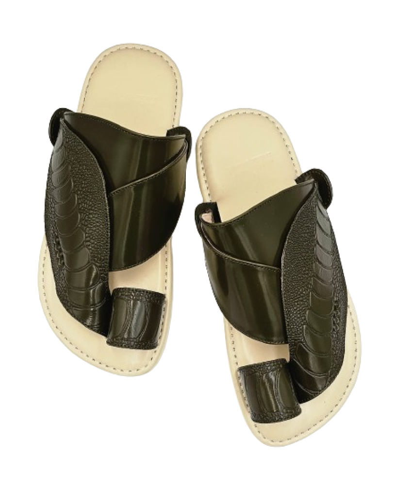 - تصميم فريد: يتميز الحذاء بنقشة ساق النعام الأنيقة التي تضفي عليه لمسة من الفخامة والتميز. اللون الزيتي الغني يجعله مناسبًا لجميع المناسبات.
