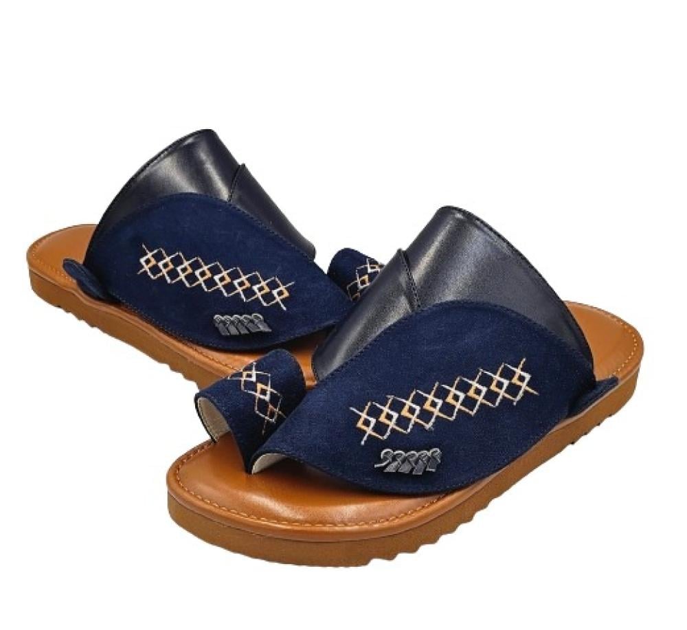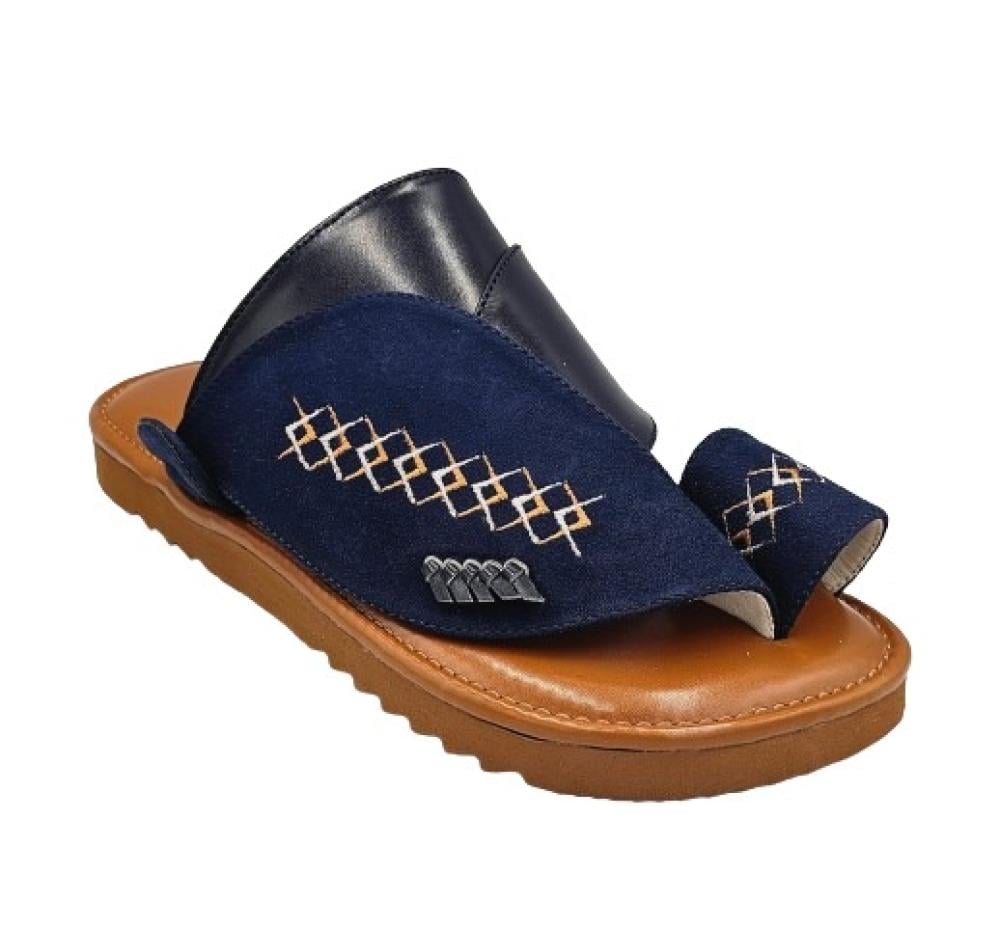 الحذاء الرسمي النعال المطرز باللون الكحلي الغامق مع تفاصيل الشمواه قطعة أساسية في خزانة أي رجل يبحث عن الأناقة الكلاسيكية مع لمسة عصرية. يجمع هذا الحذاء بين الرقي والتراث، حيث يمزج بين التقليدية والأناقة المعاصرة.