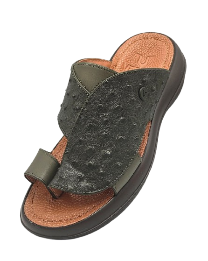 نعال إيطالي طبي بلون زيتي راقٍ ونقشة جلد النعام الفاخرة، من نسر الأحذية، أفضل متجر أحذية في السعودية. يتميز بتقنية سويسرية طبية تدعم القدم طوال اليوم، مع خامات إيطالية فاخرة تضمن مظهرًا استثنائيًا وجودة تدوم. تصميمه المفتوح وداخله المبطن يجعله خيارك الذكي للإطلالات الأنيقة والاستخدام اليومي المريح.